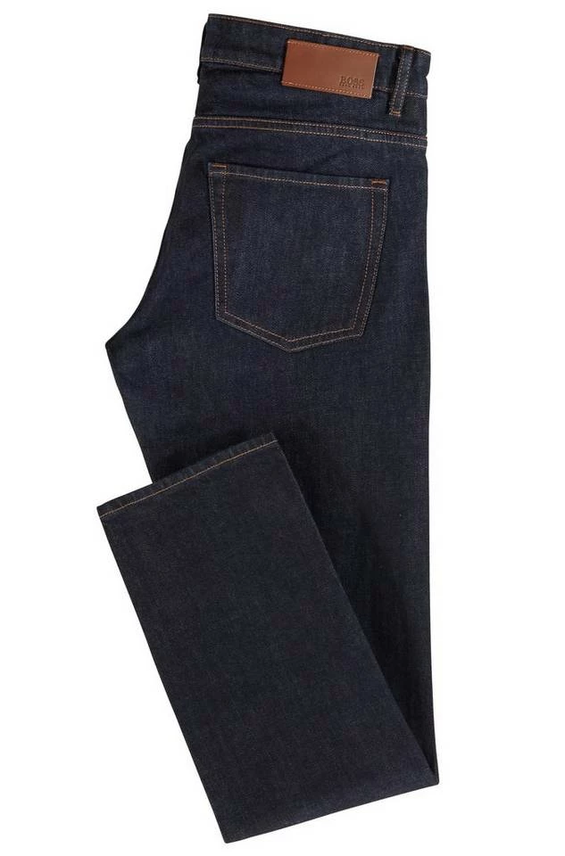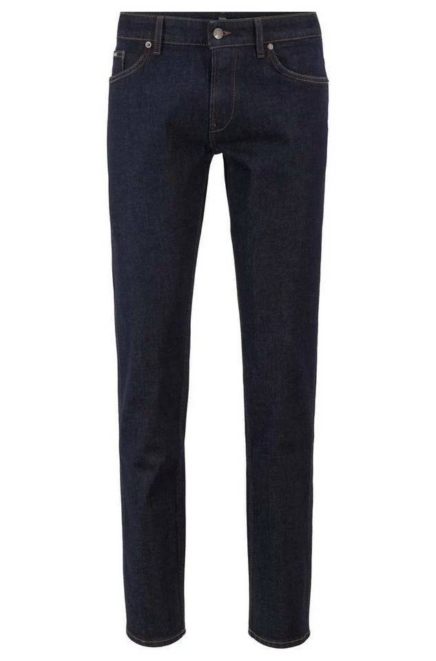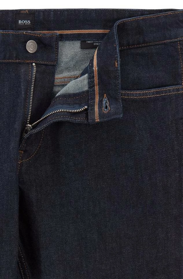 Zeitgemäße BOSS Jeans mit schmaler Passform und mittlerer Bundhöhe. Die Herren-Hose mit dunkler Waschung ist aus italienischer Stretch-Baumwolle gefertigt, die optimale Bewegungsfreiheit und zuverlässige Formbeständigkeit verspricht. Nieten, Logo-Details und kontrastfarbene Nähte verleihen dem eleganten Style einen authentischen Touch.