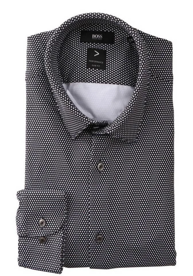 - BOSS Business Slim Fit Hemd Langarm Basic Kent Kragen Sportmanschetten Performance Stretch 4-Way-Stretch Muster Punkte schwarz