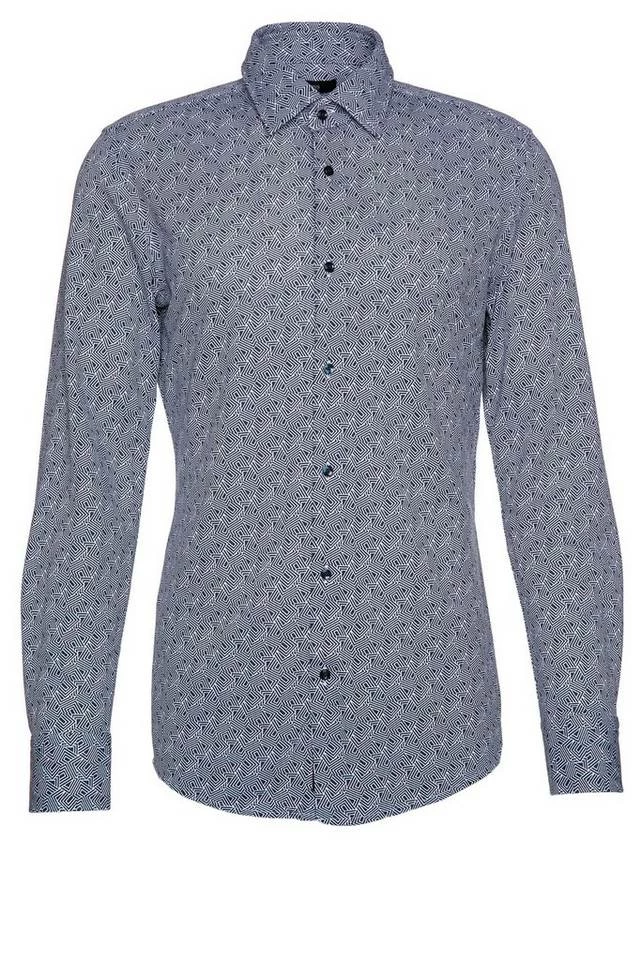 Hohe Performance verspricht dieses BOSS Hemd. Das Herren-Hemd mit zeitgemäßem Muster ist aus Stretch-Jersey aus einem elastischen Material-Mix gefertigt, der optimale Bewegungsfreiheit, Atmungsaktivität und Feuchtigkeitsregulierung verspricht. Die schmale Passform eignet sich ideal für zeitgemäße Office- und Casual-Looks. Slim Fit / Schmale Passform Kentkragen Abgerundete Manschetten