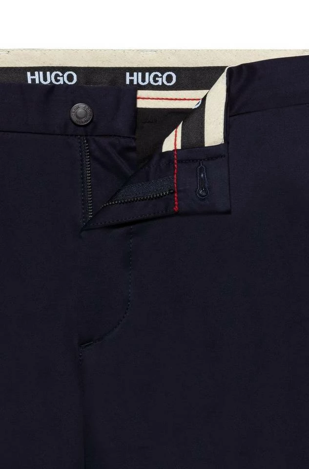 Vielseitig kombinierbare HUGO Hose mit gerader Passform und weitem Beinverlauf. Die schicke Herren-Hose aus elastischem Baumwoll-Satin hat einen mittelhohen Bund mit Logo-Tape auf der Innenseite. Ideale Grundlage für zahlreiche Casual- und Business-Looks.