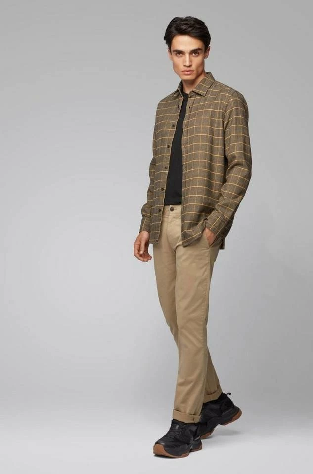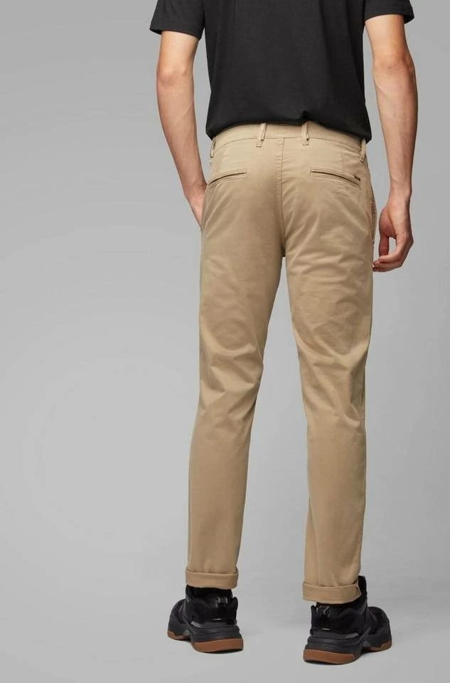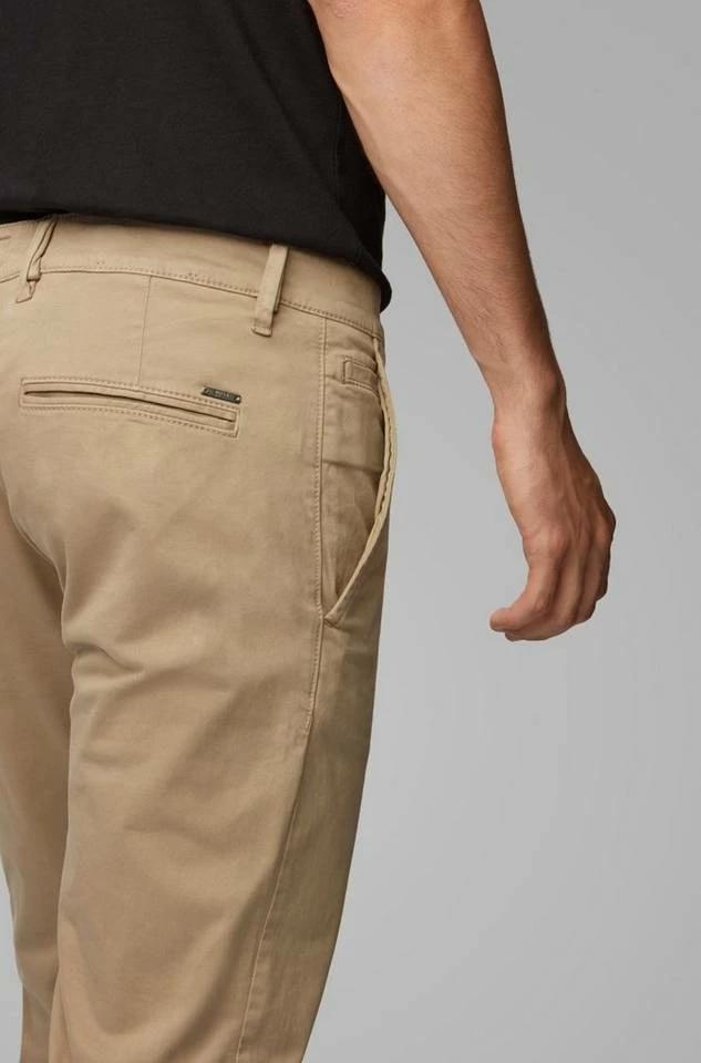 Komfortable BOSS Casual-Hose aus Baumwolle mit Elasthan-Anteil. Die schmal geschnittene Herren-Hose präsentiert sich mit Nahtdetails und ein Fischgrät-Tape innen am Bund. Das reaktive Treatment und das gebürstete Finish machen das Satin-Gewebe besonders soft. Genießen Sie ein angenehmes Tragegefühl von früh bis spät.