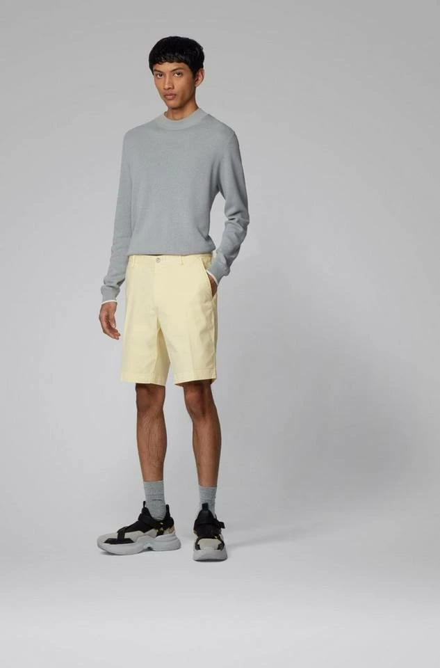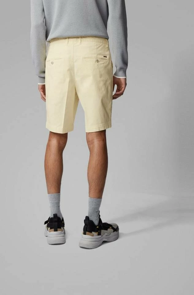 Regular-Shorts von BOSS Menswear, die mit einer Farbstoffbehandlung für einen lässigen Look versehen sind. Diese vielseitigen Shorts sind auf enge Passform zugeschnitten und aus Stretch-Baumwolle gefertigt, um die Bewegung zu erleichtern. Kombinieren Sie diese Saison mit Strickwaren, einem Hemd oder einem T-Shirt für einen entspannten Stil.