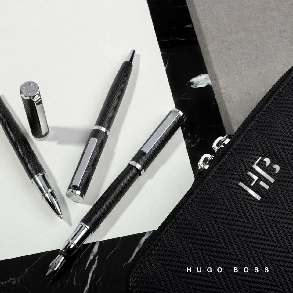 Die A4 Konferenzmappe Herringbone mit seinem raffinierten Fischgrätenmuster, das an die Anzüge des Modehauses erinnert, ist mit seiner unverwechselbaren, verchromten Metallplatte von Hugo Boss zeitlos und elegant.