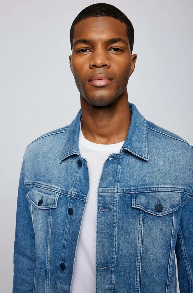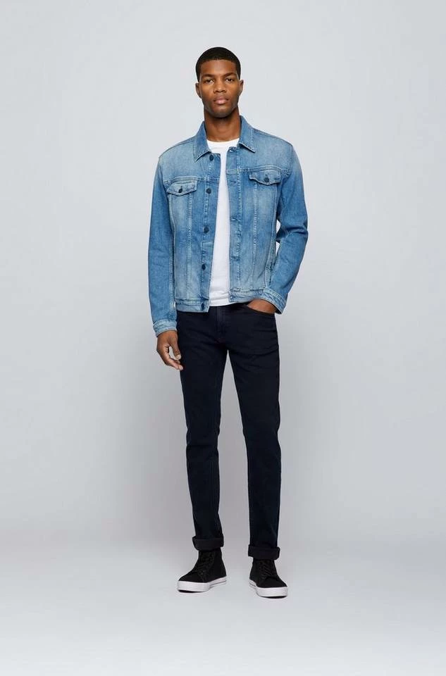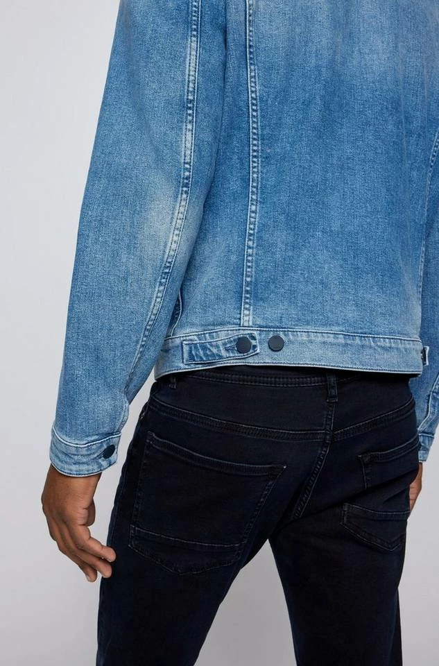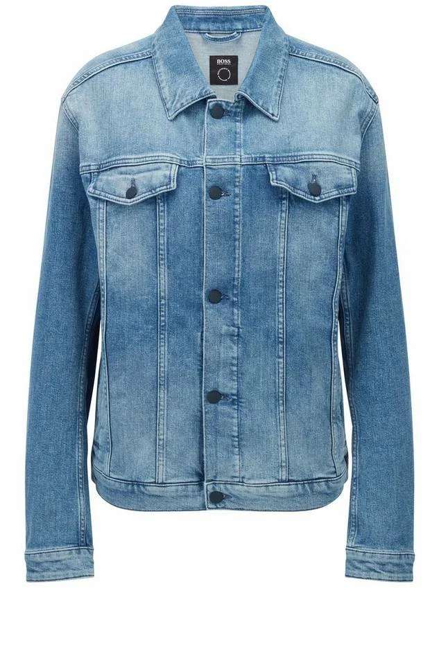 Authentische BOSS Truckerjacke. Die gerade geschnittene Herren-Jacke mit blauem Stone-washed-Finish ist mit gummierten Knöpfen versehen. Für unsere RESPONSIBLE Produkte verwenden wir immer mindestens 60 % nachhaltigere Rohmaterialien. Dieses Kleidungsstück ist zu mindestens 60 % aus zertifizierter Bio-Baumwolle gefertigt. Bio-Baumwolle wird nur mit natürlich vorkommenden Substanzen und ohne gentechnisch verändertes Saatgut angebaut. In der biologischen Landwirtschaft werden zur Schädlings- und Krankheitsbekämpfung anstelle von Chemikalien natürliche Maßnahmen, wie Wechselwirtschaft und Kompostieren, eingesetzt. Das Kleidungsstück besteht zum Teil aus recyceltem Polyester. Recycelter Polyester ist eine Kunstfaser aus ölbasierten Abfällen wie alten PET-Flaschen. Es handelt sich dabei um eine nachhaltigere Option als bei herkömmlichem Polyester, da ein bereits produziertes Material erneut zum Einsatz kommt. Die Verwendung von recyceltem Polyester reduziert darüber hinaus Kunststoffabfälle und verhindert, dass diese auf Deponien enden. Wir verwenden nur Rohstoffe aus einer nachverfolgbaren Produktkette, um sicherzustellen, dass es sich um zertifizierten recycelten Polyester handelt. Regular Fit / Normale Passform Hemdkragen Anzahl der Knöpfe: 4 oder mehr Knöpfe Brusttaschen mit Patte Knopf-Manschetten Standardlänge