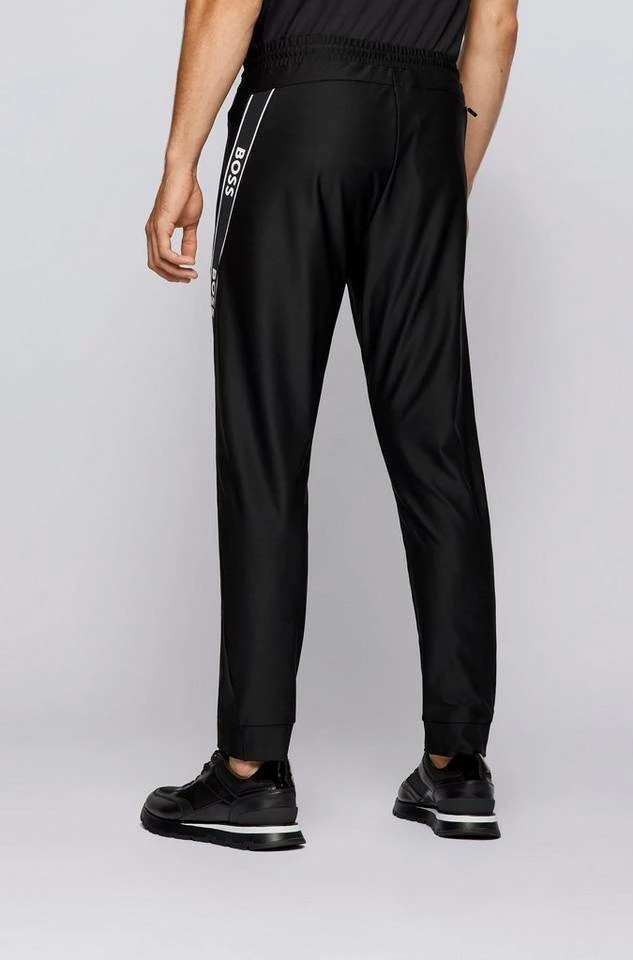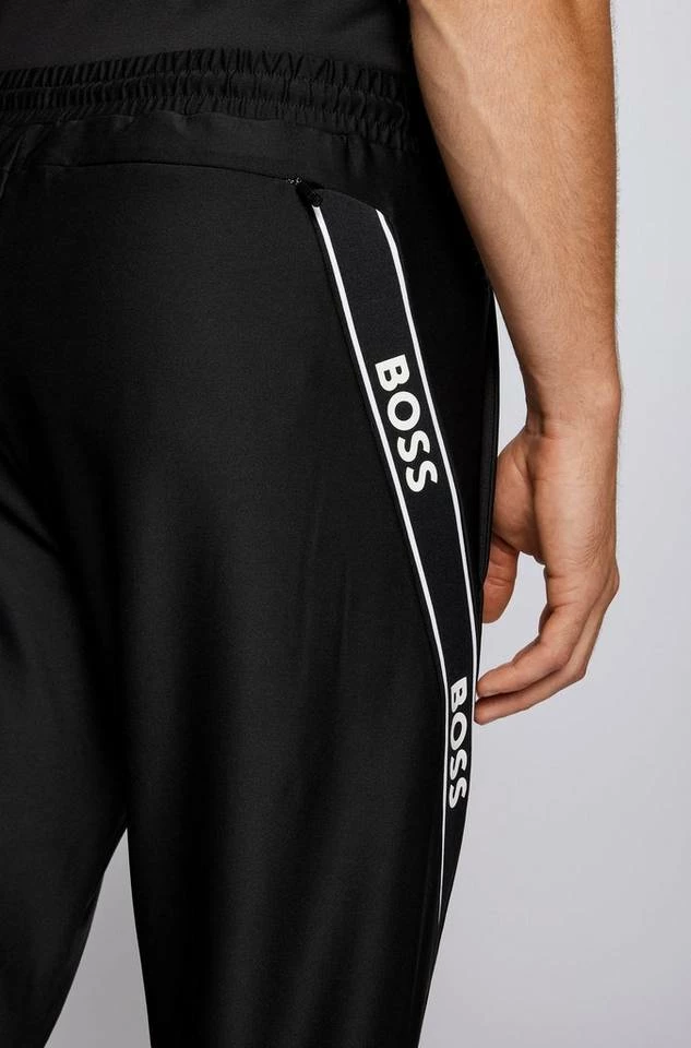 Leicht kombinierbare BOSS Jogginghose. Die schmal geschnittene Herren-Hose mit zeitgemäßer Silhouette ist aus einem elastischen Material-Mix gefertigt, der zu 87 % aus recycelten Fasern besteht, um die Auswirkungen auf den Planeten zu reduzieren. Dynamische Teilungsnähte werden durch Logo-Tape-Einsätze betont. Bei der Herstellung unserer Produkte sind wir immer auf der Suche nach nachhaltigeren Lösungen. Slim Fit / Schmale Passform Elastischer Bund mit Tunnelzug Seitliche Taschen , Gesäßtasche mit Reißverschluss