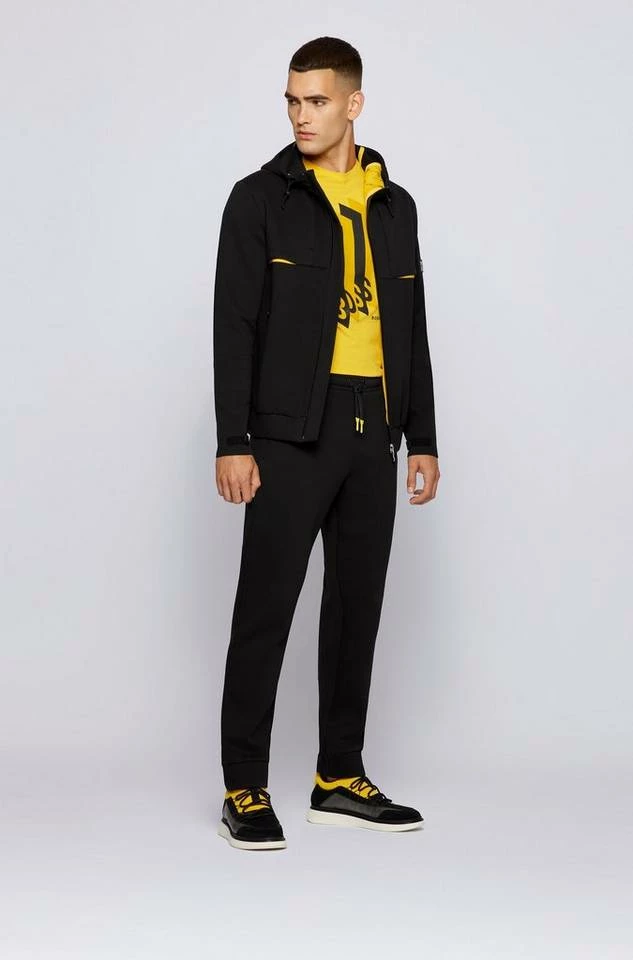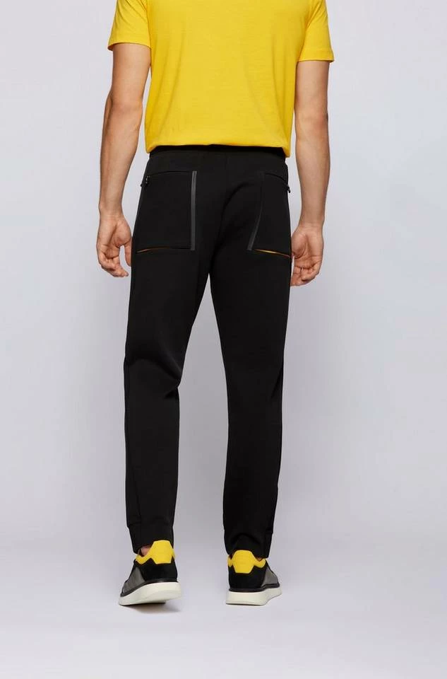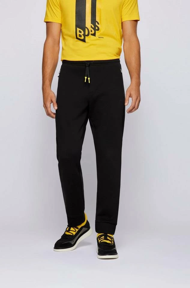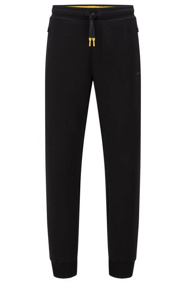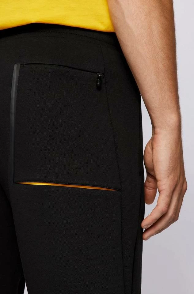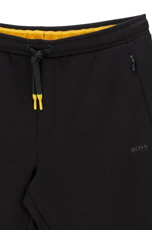 BOSS Jogginghose mit gerader Passform und mittlerer Bundhöhe. Die Herren-Hose aus Stretch-Piqué ist aus einem elastischen Baumwoll-Mix gefertigt. Sie besitzt kontrastfarbene Kordelenden und einem BOSS Logo-Print. Plissees auf den Gesäßtaschen sorgen für die typische Liebe zum Detail. Regular Fit / Normale Passform Mittlere Bundhöhe Elastischer Tunnelzug Seitliche Reißverschlusstaschen Aufgesetzte Tasche am Gesäß