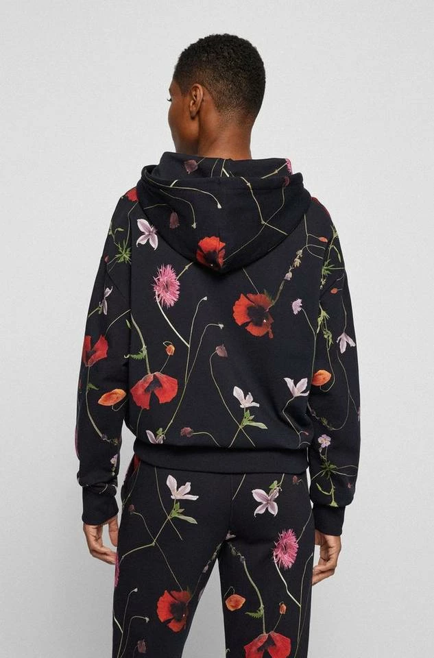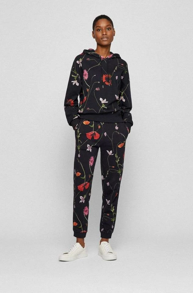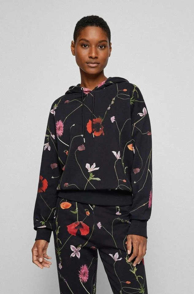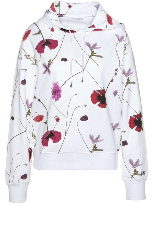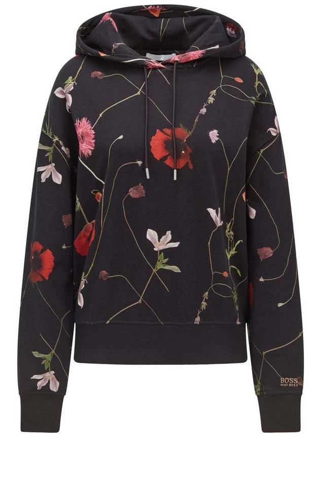 BOSS Kapuzen-Sweatshirt mit einem durchgehenden Blumen-Print, der sich durch die neue Kollektion zieht. Der gerade geschnittene Damen-Hoodie aus reiner Baumwolle ist mit einer Kordel mit Metallenden an der Kapuze versehen. Gerippte Bündchen aus Stretch-Baumwolle an Saum und Ärmeln sorgen für hohen Tragekomfort und langanhaltende Formbeständigkeit. Ein dezentes Logo am linken Ärmel rundet den Style charakteristisch ab. DamenHoodie von BOSS Womenswear Regular Fit / Normale Passform Mit Kapuze Lange Ärmel Rippbündchen