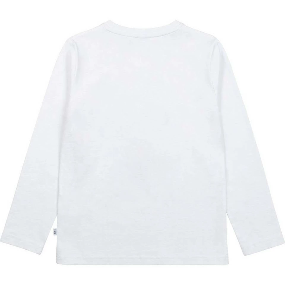 Schönes Langarmshirt der Designermarke Hugo Boss. Es ist weiß mit Illustration und Logo auf der Brust