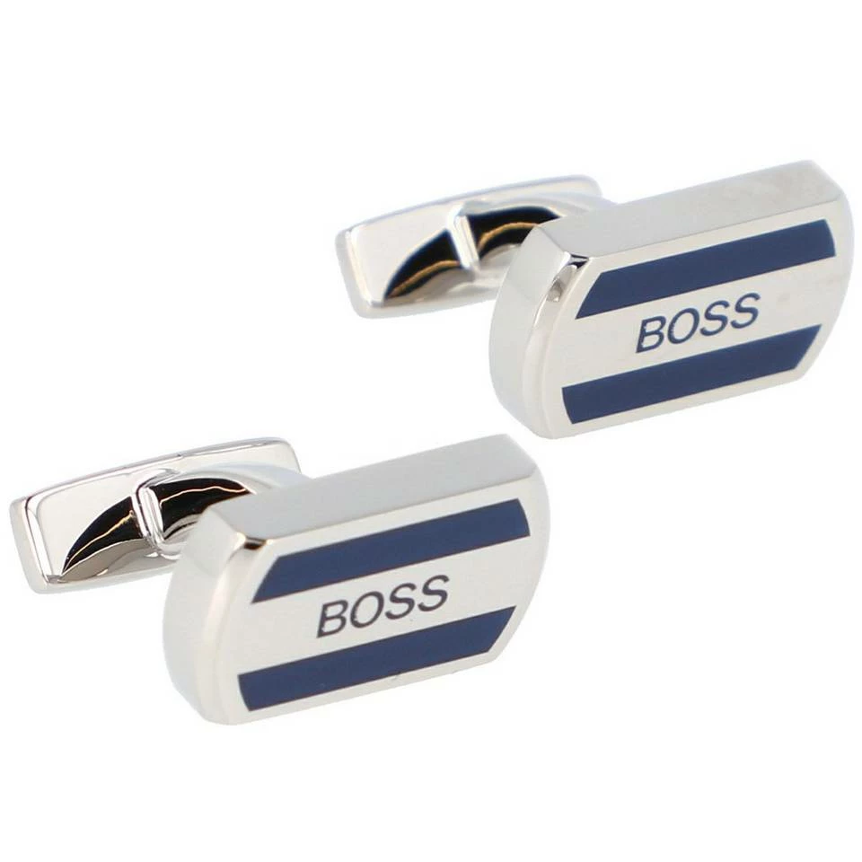 Elegante, eckige Manschettenknöpfe von Boss aus robustem Messing mit kontrastfarbenem Emaille-Einsatz und Label-Prägung. Dieses exklusive Accessoire verleiht dem gesamten Look eine schickere Note.