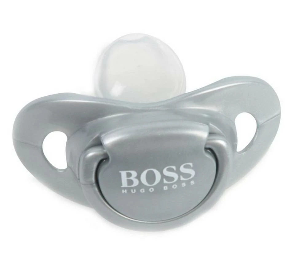 HUGO BOSS Designer LOGO Schnuller grau hellgrau super als Babygeschenk geeignet. Bitte nicht in die Spülmaschine geben!
