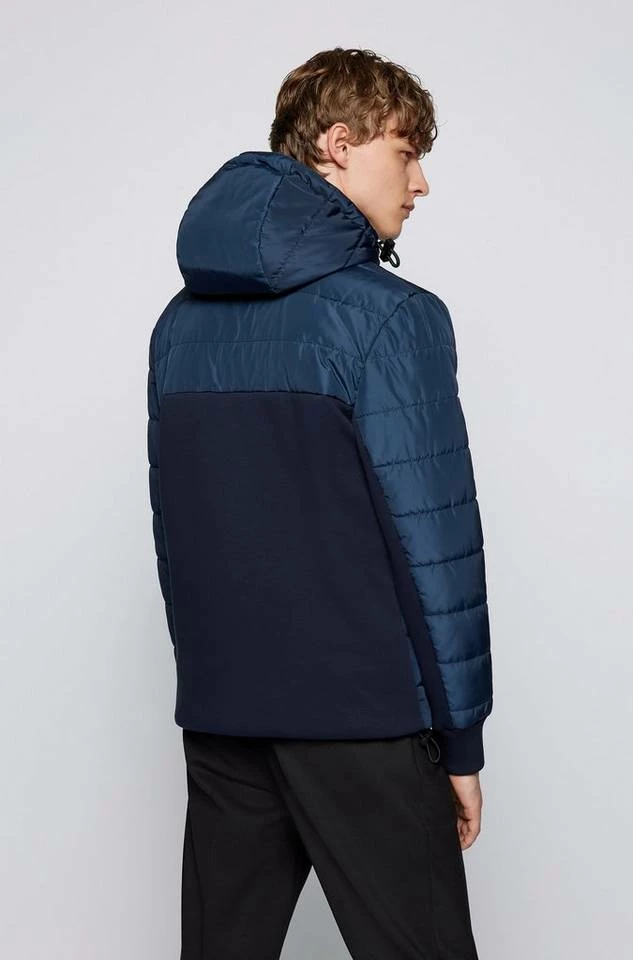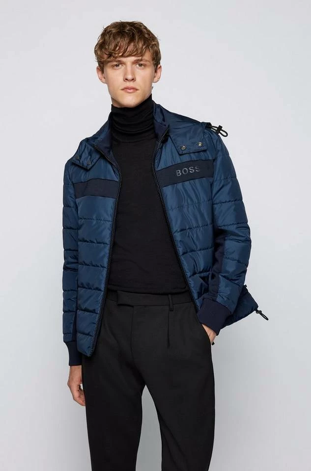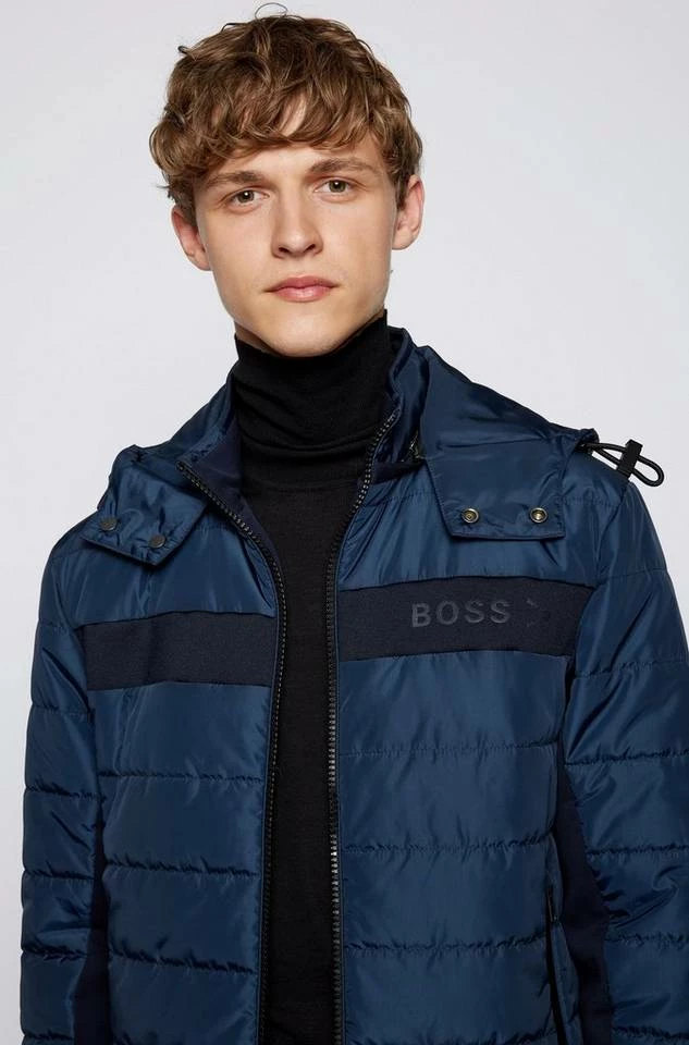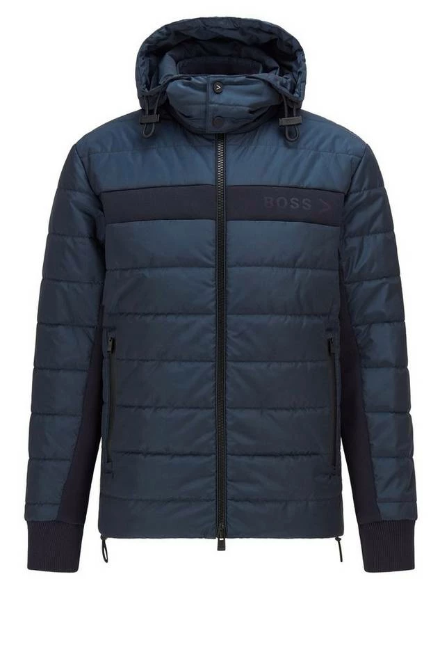 Sportive BOSS Jacke mit wasserabweisendem Finish und abnehmbarer Kapuze. Die gerade geschnittene Herren-Jacke mit abgesteppter Füllung an Ärmeln, Vorderseite und Rückenpasse ist aus verschiedenen Materialien gefertigt, darunter ein Baumwoll-Mix mit Piqué-Struktur. Auf der linken Brust befindet sich ein charakteristisches BOSS Logo. Regular Fit / Normale Passform Mit Kapuze Seitliche Reißverschlusstaschen Kurze Ärmel Rippbündchen Standardlänge