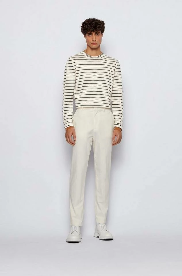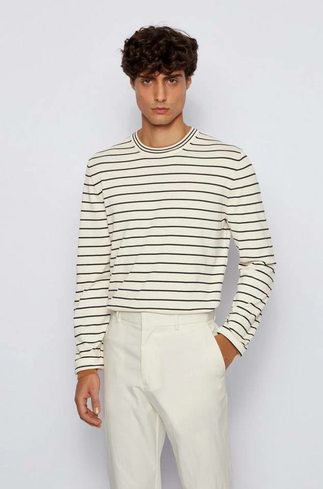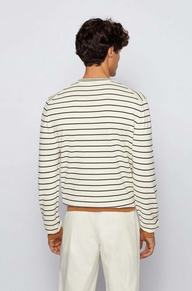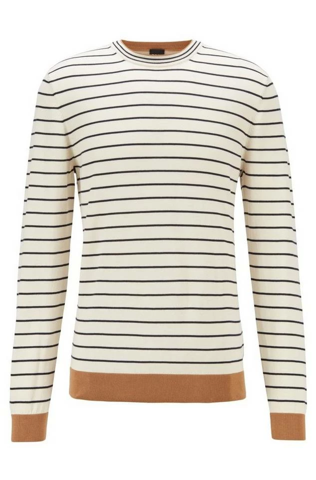 Maskuliner BOSS Pullover mit gerader Passform. Der Herren-Pullover ist aus reiner Baumwolle gestrickt, die für einen cleanen Look und ein angenehmes Tragegefühl sorgt. Querstreifen zeichnen den Style aus. Colour-Block-Details an Saum, Ärmelbündchen und innen am Kragen sorgen für ein zeitgemäßes Finish.