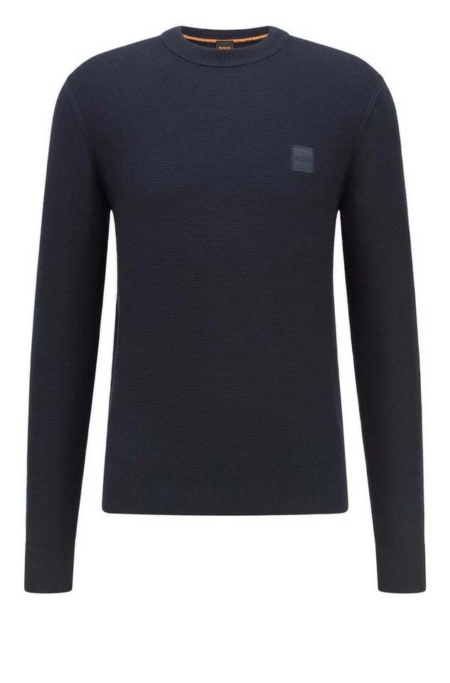 Maskuliner BOSS Pullover mit gerader Passform. Dieser Pullover für Herren mit normaler Passform und einem Logoaufnäher auf der linken Brust ist aus einem weichen Baumwoll-Mix mit Kaschmir-Anteil für luxuriöse Weichheit gefertigt. Innen am Kragen befindet sich eine charakteristische orangefarbene Paspel für den besonderen Reiz. Regular Fit / Normale Passform Rundhalsausschnitt Lange Ärmel Rippbündchen Standardlänge