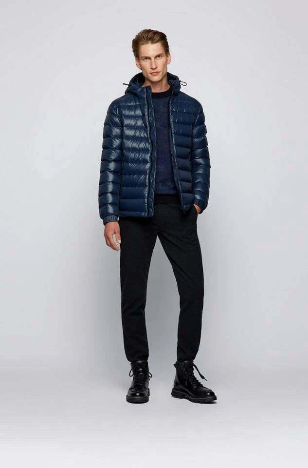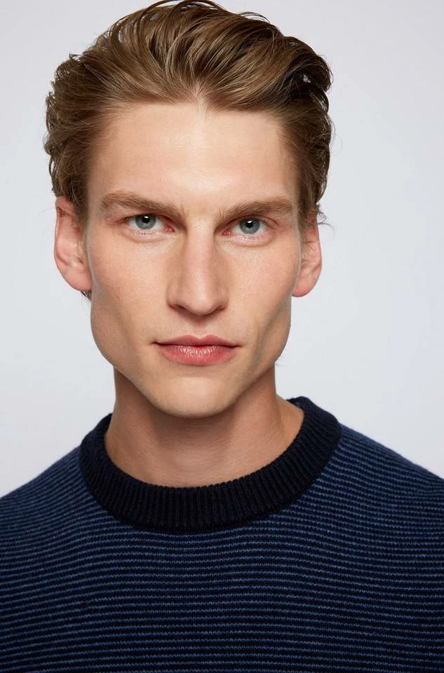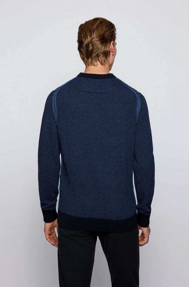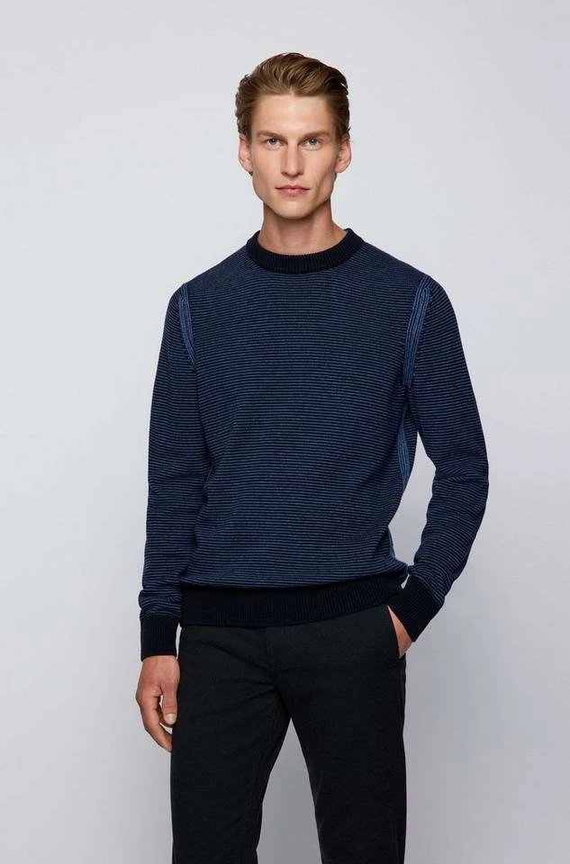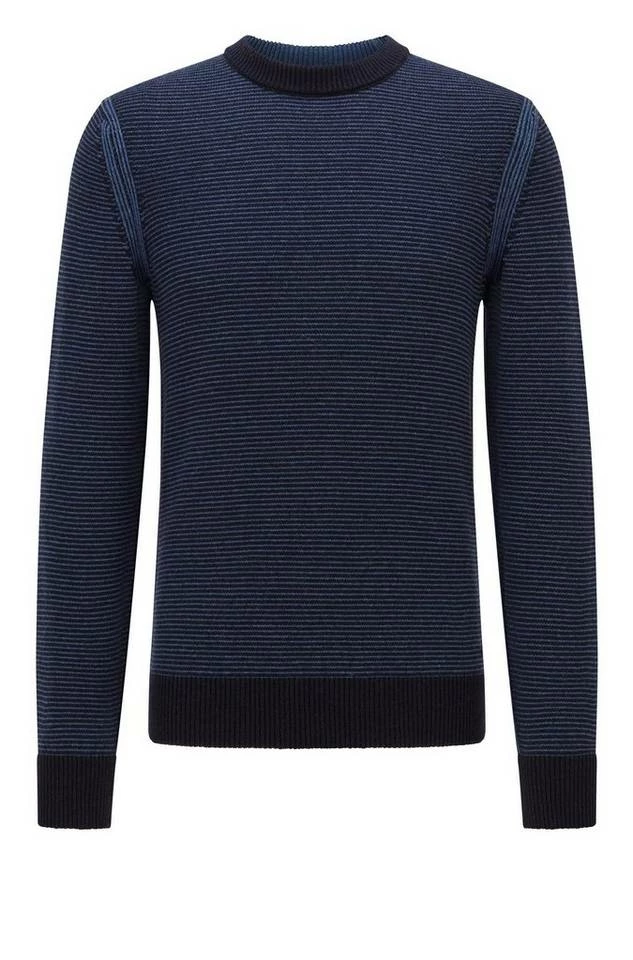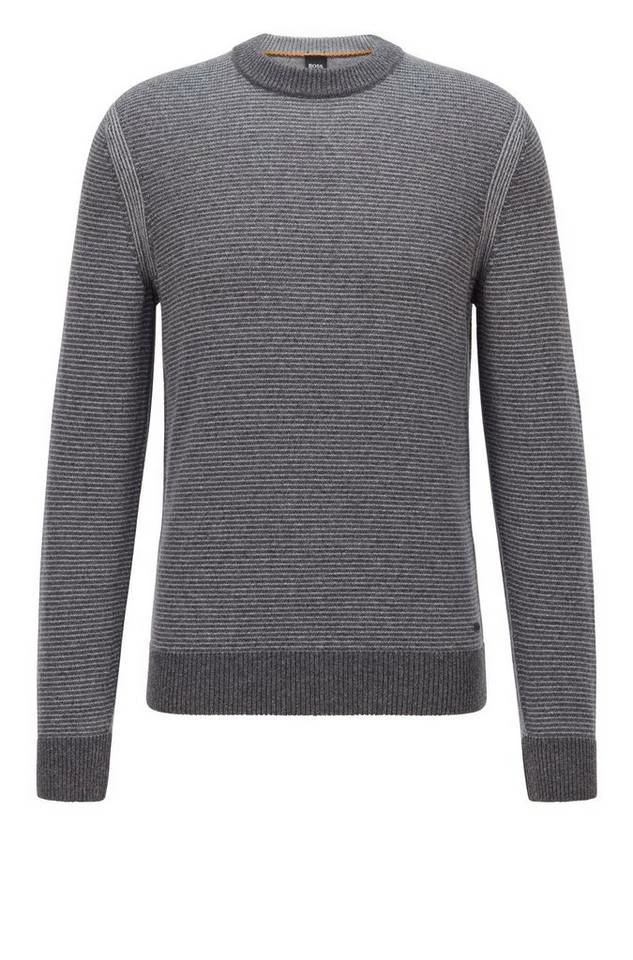 Zeitgemäßer BOSS Pullover mit gerader Passform für eine legere Silhouette. Der Herren-Pullover ist mit einem BOSS Logo-Aufnäher am Saum versehen. Strukturierte Streifen zeichnen den Style aus Garnen mit Woll- und Baumwoll-Anteil aus, der atmungsaktiven Tragekomfort verspricht. Ein charakteristischer Streifen innen am Kragen rundet das Design ab. Regular Fit / Normale Passform Rundhalsausschnitt Lange Ärmel Rippbündchen an Saumabschlüssen Standardlänge
