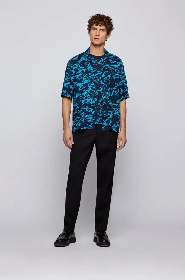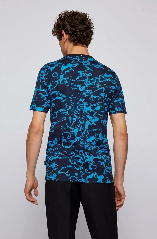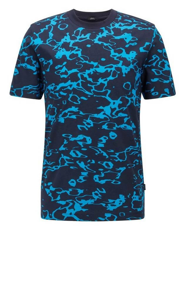 Besonders softes BOSS T-Shirt mit merzerisiertem Finish. Das Herren-Shirt aus reiner Baumwolle verspricht natürlichen Tragekomfort und Atmungsaktivität. Ein durchgehender Print mit dem Motiv der Saison setzt ein Statement. Dank der schmalen Passform eignet sich der Style ideal für zeitgemäße Casual-Looks. Slim Fit / Schmale Passform Rundhalsausschnitt Kurze Ärmel