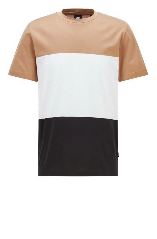 Feines BOSS T-Shirt mit charakteristischem Streifen hinten am Kragen. Das legere Herren-Shirt mit Rundhalsausschnitt ist aus reinem Baumwoll-Jersey gefertigt, der hohen Tragekomfort verspricht. Die Block-Elemente sind durch eine spezielle Stricktechnik miteinander verbunden. Die gerade Passform erzeugt eine unbeschwerte Silhouette – ideale Wahl für jeden Tag. Regular Fit / Normale Passform Rundhalsausschnitt Kurze Ärmel
